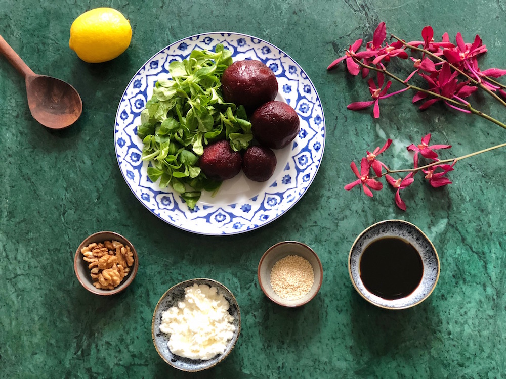 Web Voor de rode bietjes. Schil de bieten en snijd in plakken. 750 gram voorgekookte gare bietjes Snuf zout en peper 1 el.
